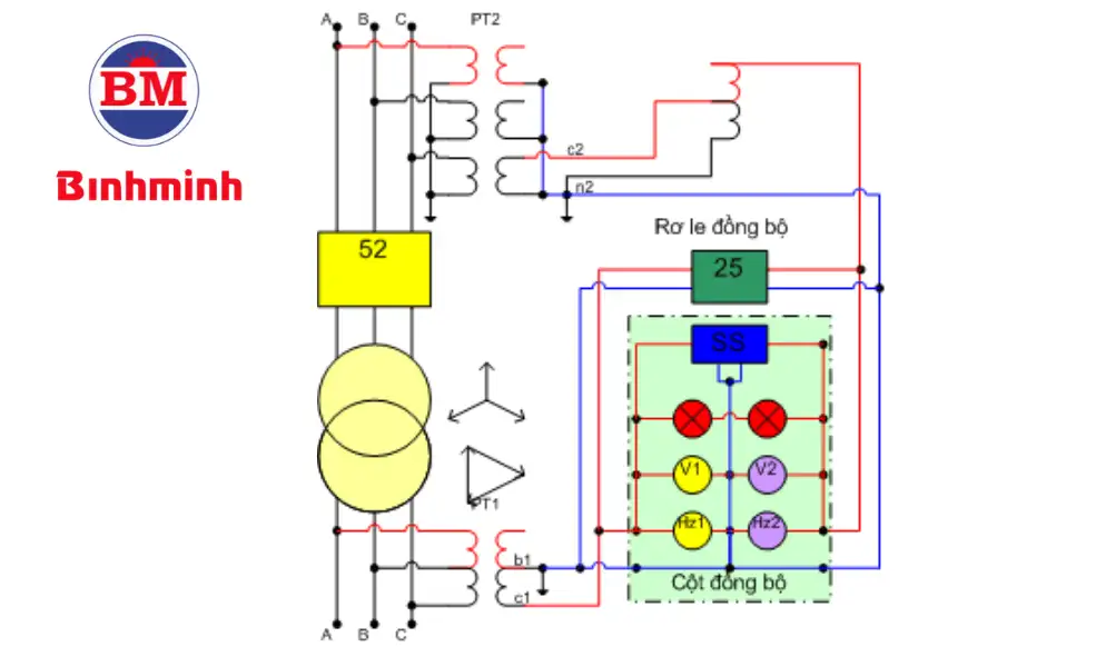 Bộ điều khiển đồng bộ : Là thành phần quan trọng nhất, có chức năng đo lường và so sánh các thông số điện. Sau đó, nó sẽ tự động điều chỉnh tốc độ và điện áp của các máy. Để đảm bảo các điều kiện hòa đồng bộ được thỏa mãn.
