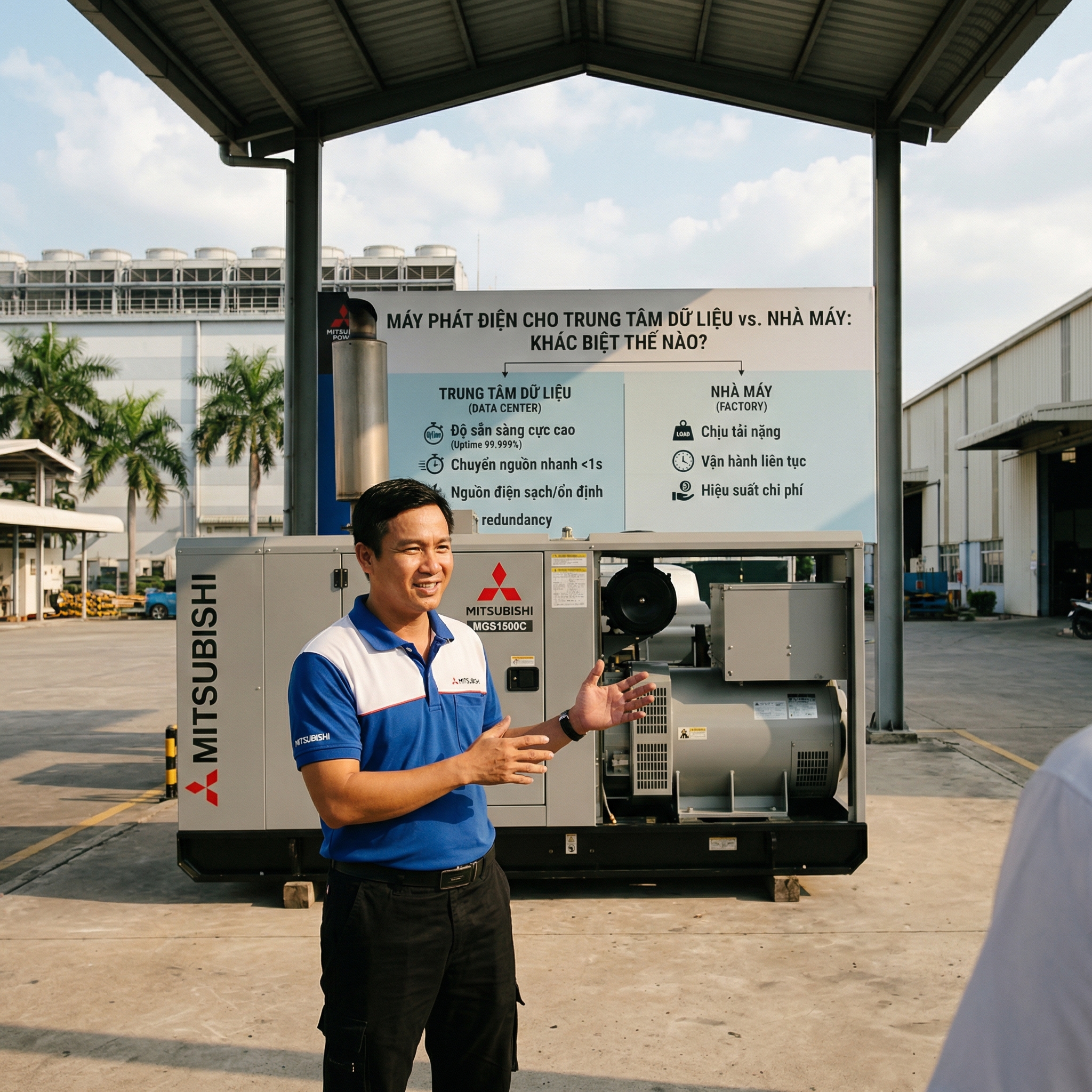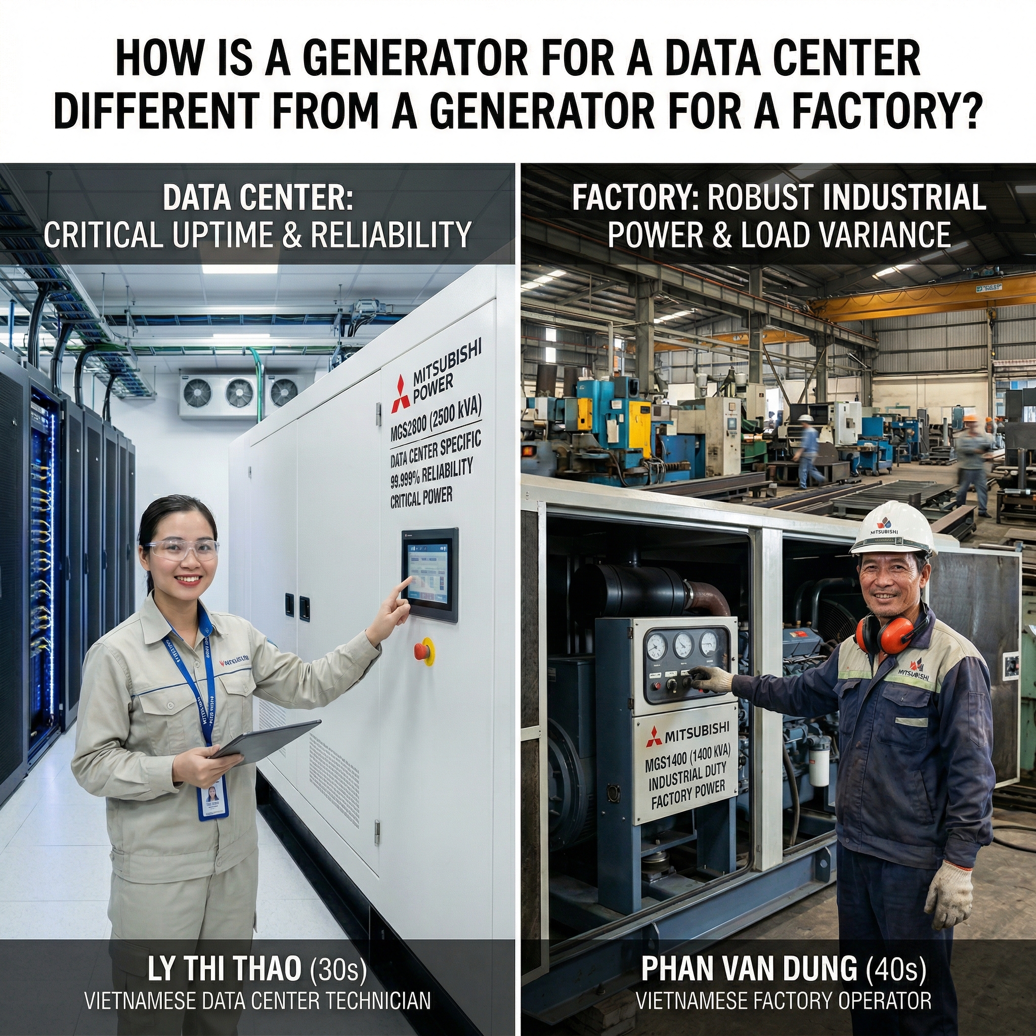 Một nhà máy có thể ưu tiên công suất lớn, tải động cơ, độ bền cơ khí và chi phí đầu tư tối ưu. Trong khi đó, một trung tâm dữ liệu lại ưu tiên nguồn điện sạch, ổn định, phản ứng nhanh, khả năng tích hợp với UPS và độ sẵn sàng cực cao.